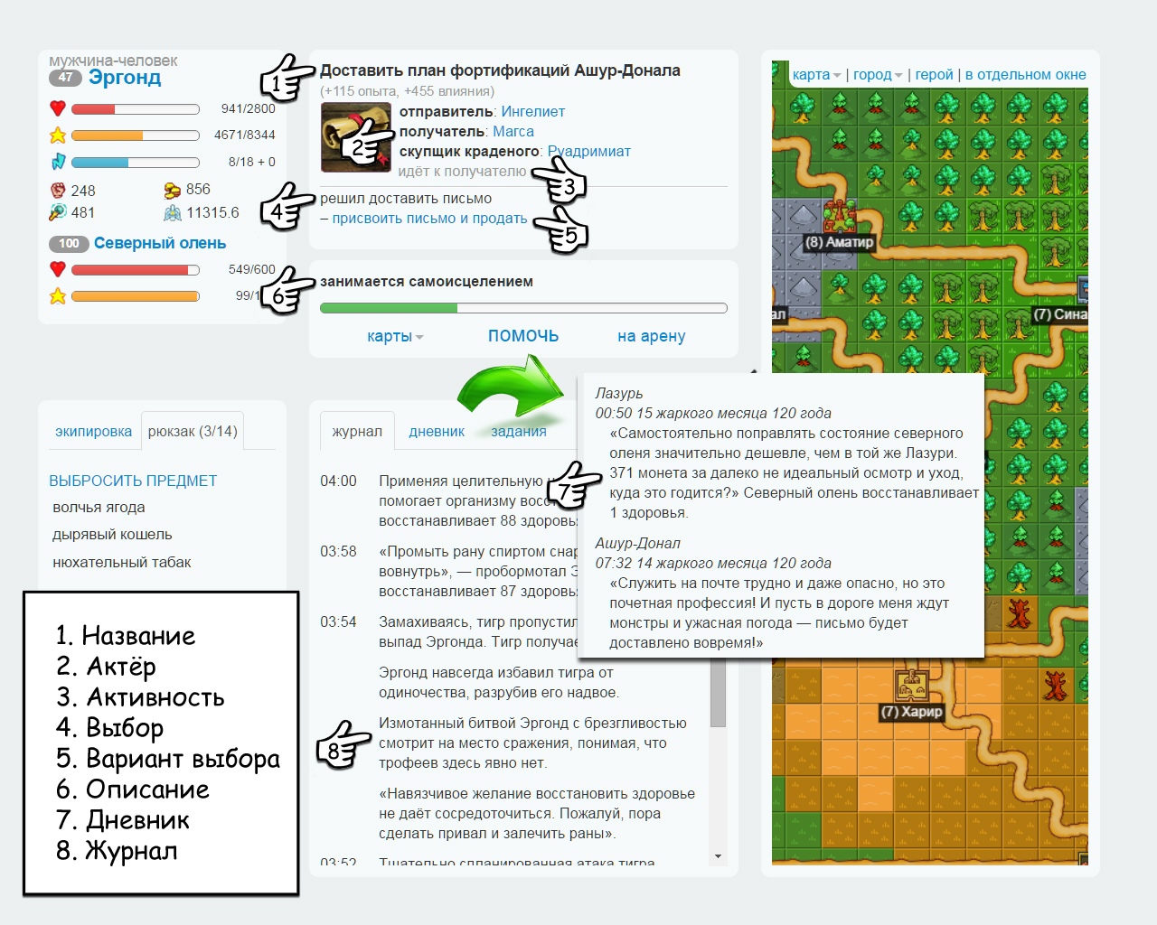 - Активность: текст в информации о задании, описывающий суть текущих действий героя в рамках задания (отображается в блоке задания под картинкой, поэтому фраза должна быть краткой и общей);